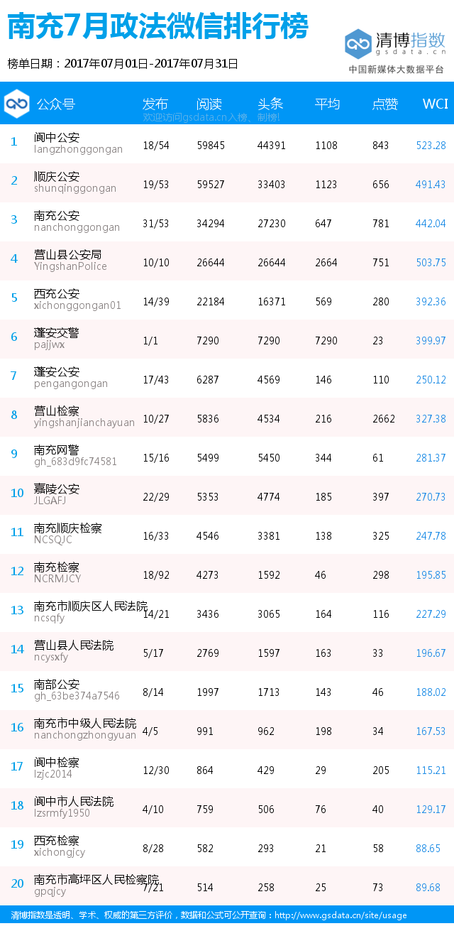 此次采集数据的时间是2017年7月1日至31日。特别说明的是,尽管团队尽全力搜罗,但仍难免有所遗漏。若政法微信公众号对排行榜感兴趣,请及时与我们联系,一起来冲榜!!