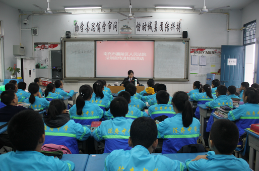 初一(七)班李嘉懿同学对记者说:“两位法官的讲解非常精彩,所讲的法律知识很贴近我们,案例也均发生在嘉陵,听了之后我很受教育,增长了不少法律知识,明白了法律的红线,懂得了法律的威严,更学会了如何用法律来保护自己”