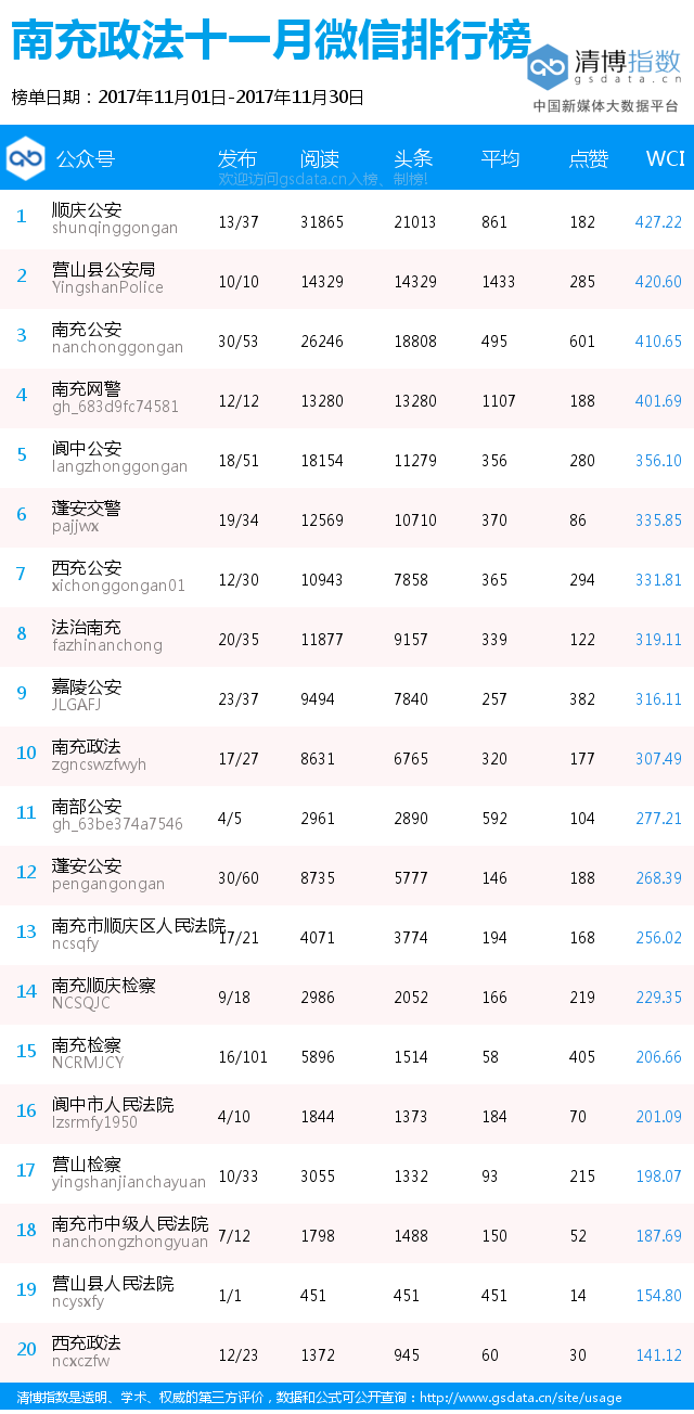 此次采集数据的时间是2017年11月1日至30日。特别说明的是,尽管团队尽全力搜罗,但仍难免有所遗漏。若政法微信公众号对排行榜感兴趣,请及时与我们联系,一起来冲榜!!