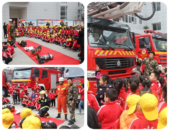 “小宝贝们,这种黄色的战斗服是轻型防化服,用于化学品泄漏时候的危情处置;这一种深蓝色的斗服是灭火战斗服,平时我们的消防战士扑救火灾时就是穿着它冲进火场战斗;这一种带有头盔橘黄色的连体战斗服是防蜂服,在夏秋湿热季节毒马蜂活跃期,我们时常接警去处置扰民的毒马蜂窝;在它旁边的是空气呼吸器,主要用于弥漫浓烟和有毒气体环境下的战斗防护…..”上午9点钟活动开始进行,消防宣讲员详细的向幼稚园师生展示了战斗服、空气呼吸器、机动链锯以及抢线救援工具等各类消防装备器材的使用方法和用途。