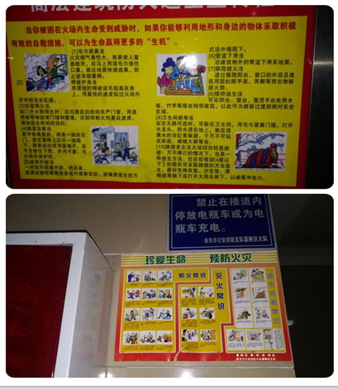“禁止在楼道内停放电瓶车或为电瓶车充电”标语醒目地提醒大家在使用电瓶车,一定要在物业指定位置进行充电,同时不得乱停乱放占用楼道;系列“珍爱生命、预防火灾”系列图识,以图文并茂的方法让大家学到简单的防火常识,日常的灭火常识,以及地震火灾逃生自救方法,以此提高群众在火灾事故发生时的灭火逃生自救能力;“高层建筑防火逃生宣传栏”以图文形式向高层小区的居民介绍了常见的高层逃生十种方法,让大家学会利用地形和身边的物体采取积极有效的自救措施,以此成功自救。